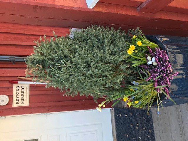 Ute er det blitt ryddet og kjørt vekk bråte. Vi har en god samarbeidspartner, Hagelaget, som planter i krukker og gjør det hyggelig på tunet.